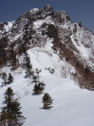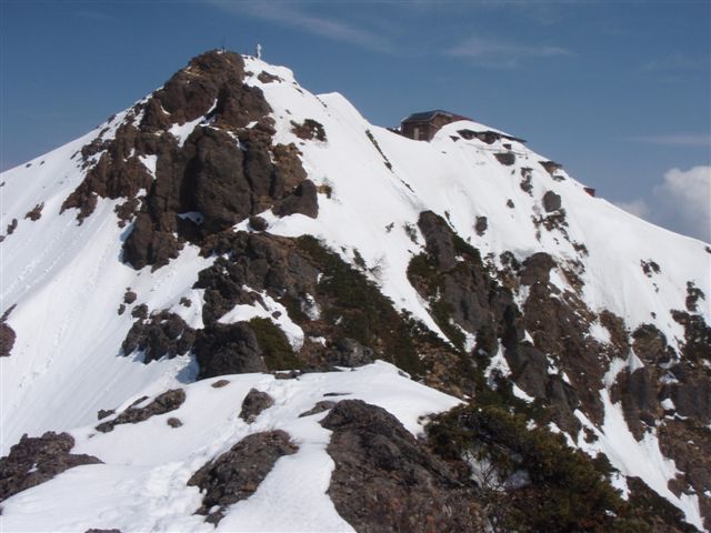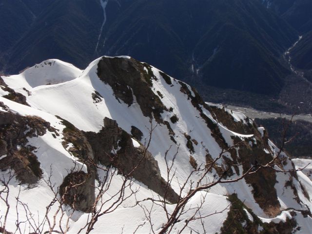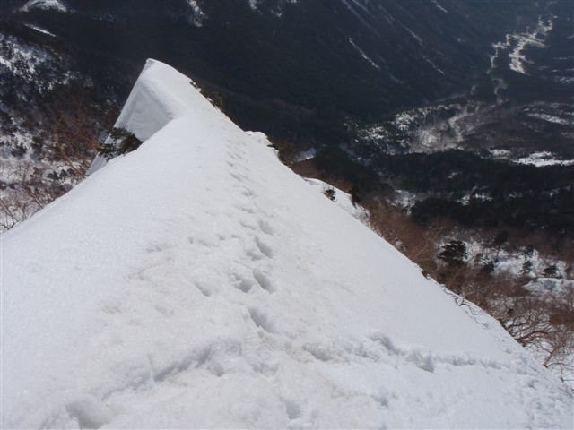 昨日は、この細い稜線を登ってきました。何箇所かは、雪が崩れるのではないかと思われる箇所もありました。感覚的には、雪稜は、、3月中が安定しているような気がしますが、3月は、まだ冬山で寒さが厳しいです。