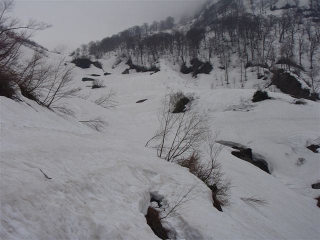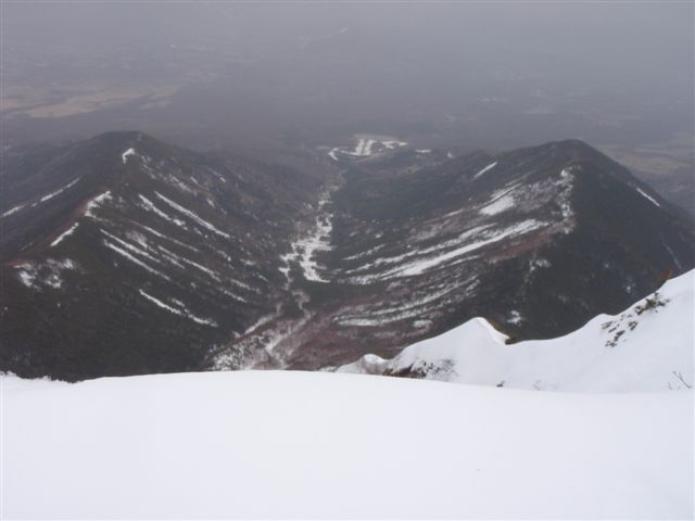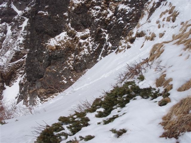 積雪期にはじめての下降に不安は、残りましたが、視界もあり、安定した状態で下降ができました。しかし、枝沢、特に杓子岳からは、いくつもの雪崩の痕跡がありました。