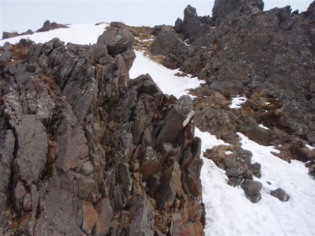 いきなりいやらしいトラバースとなる。写真では、分からないが左下はスッパリと切れ落ち込んでいる。