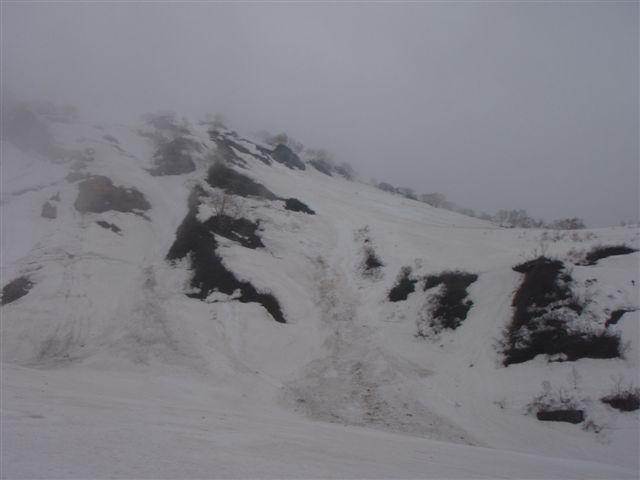 登りながら、残雪の状況を確認していましたので、帰りは、グリセードで下山するつもりでしたが、雪が柔らかすぎて尻セードで下りました。