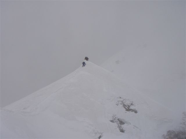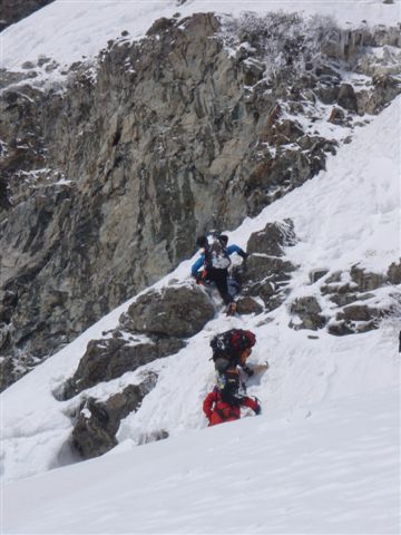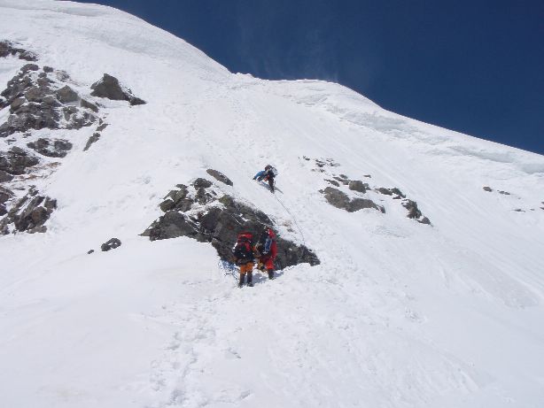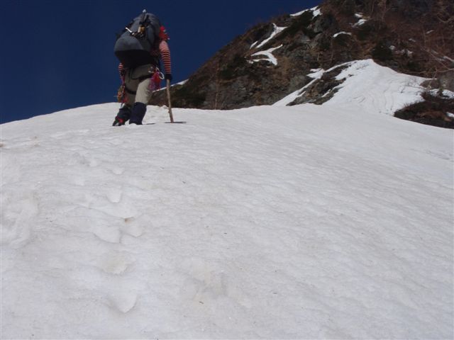 最後の60mの雪壁は、写真で見るより、実際は、かなり急斜面です。最後の3mは、ほぼ垂直な壁になっています。滑落は、致命傷になりますので、可能な限りザイルを出すことが必要ですが、私は、この壁を2回ともノーザイルで越えました。しかし、今後は、可能な限りザイルを出していこうと思います。