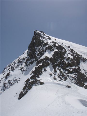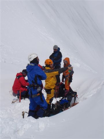最後の60mの雪壁を前にして、山頂直下に集まった登山者。
