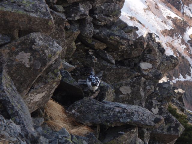雷鳥は、天然記念物ですが、カモシカ同様に頻繁に見ることができます。今回の山行でも、明神岳と白馬岳で見ました。白馬の雷鳥は、まだ真っ白でした。吹雪の中、風に向かって、空中でほぼ停止状態の珍しい状況を見ることができました。写真に撮ることができなくて残念です。